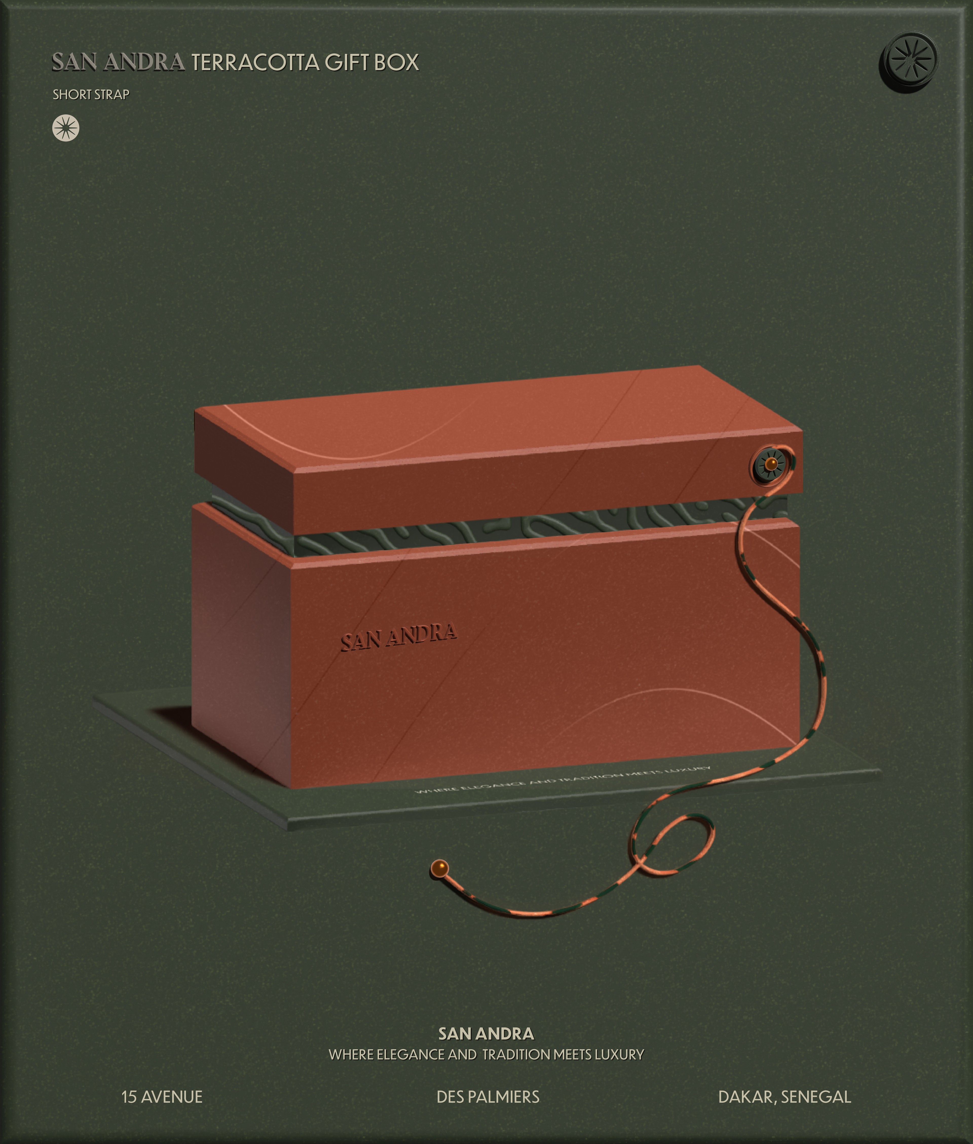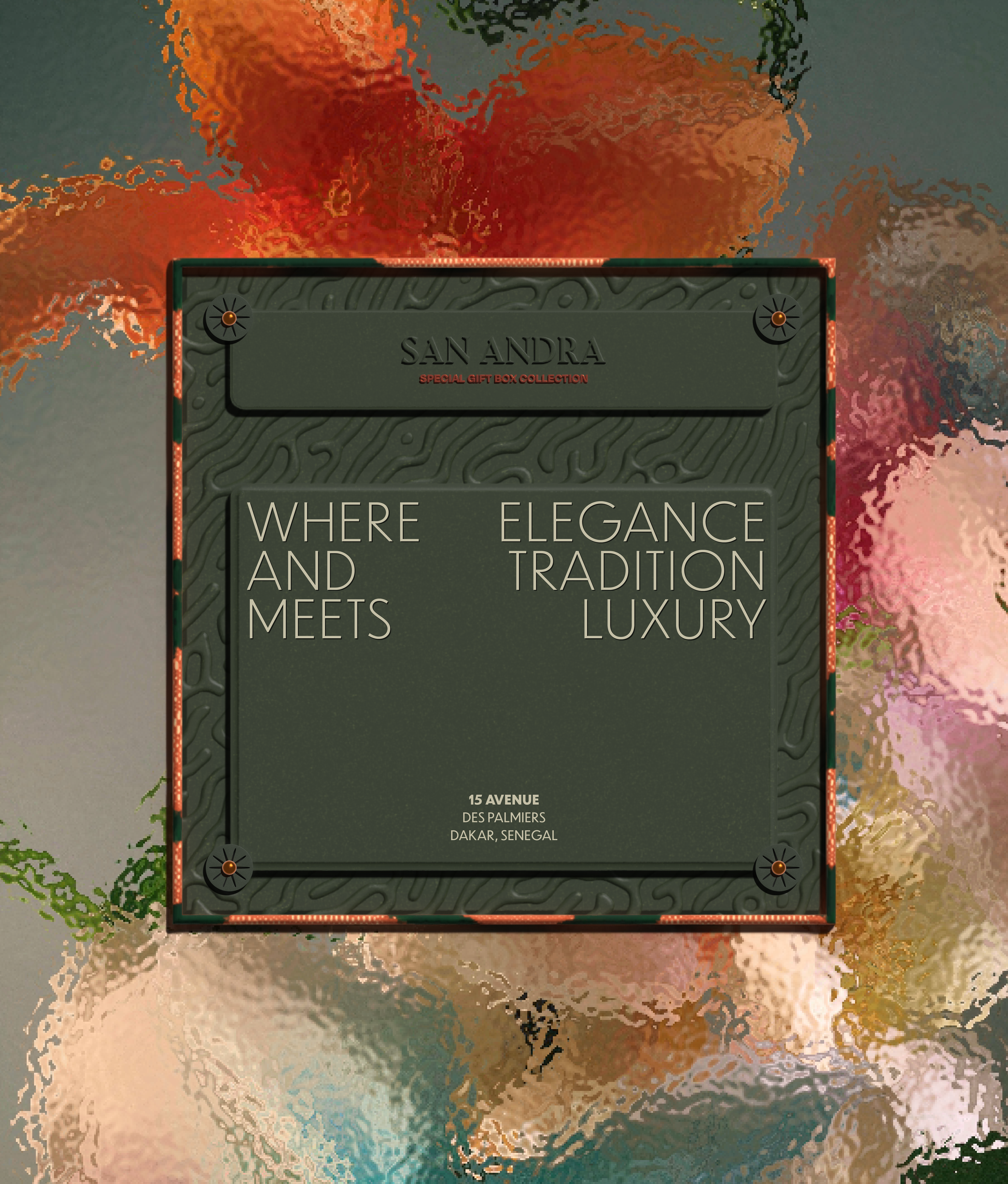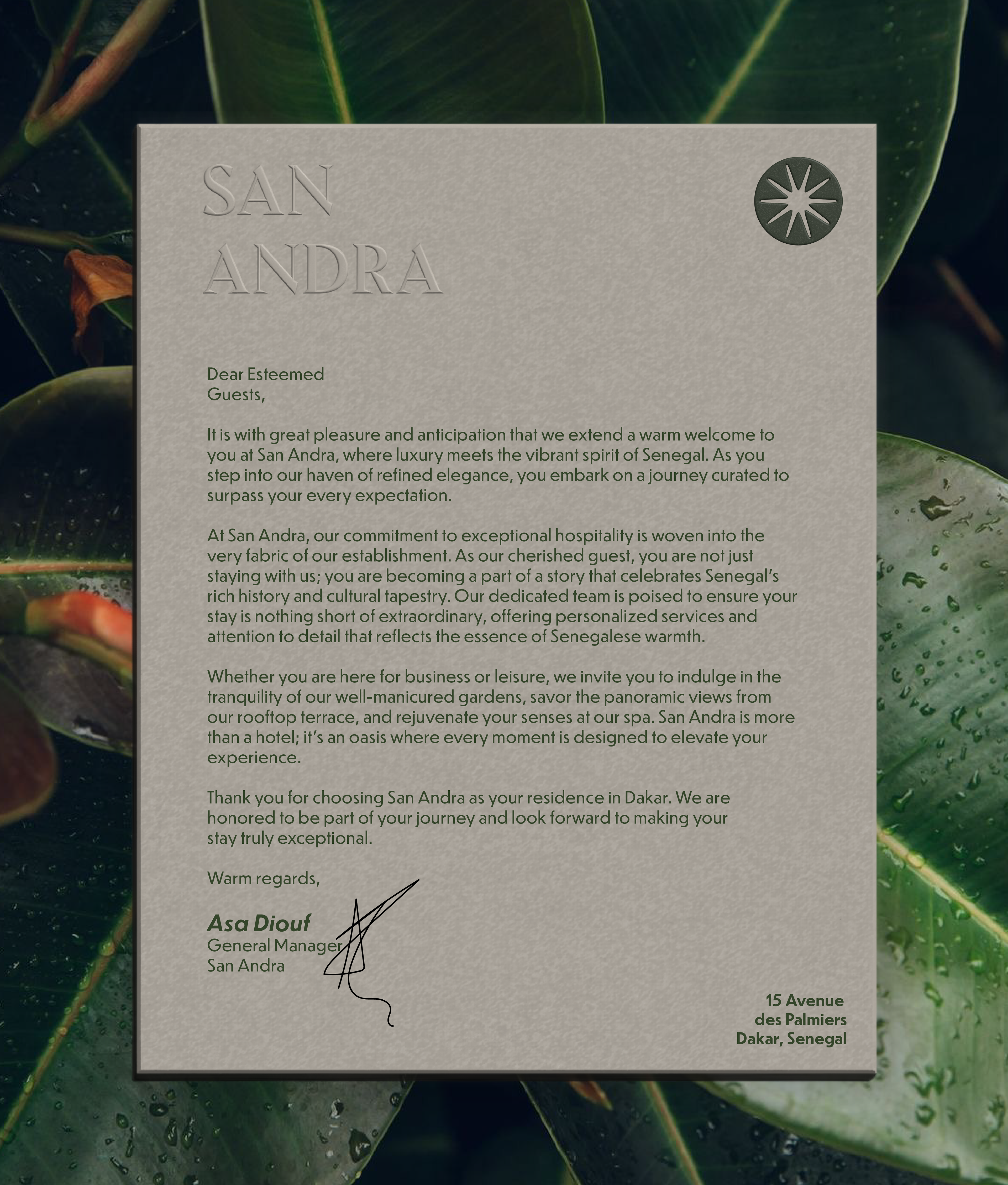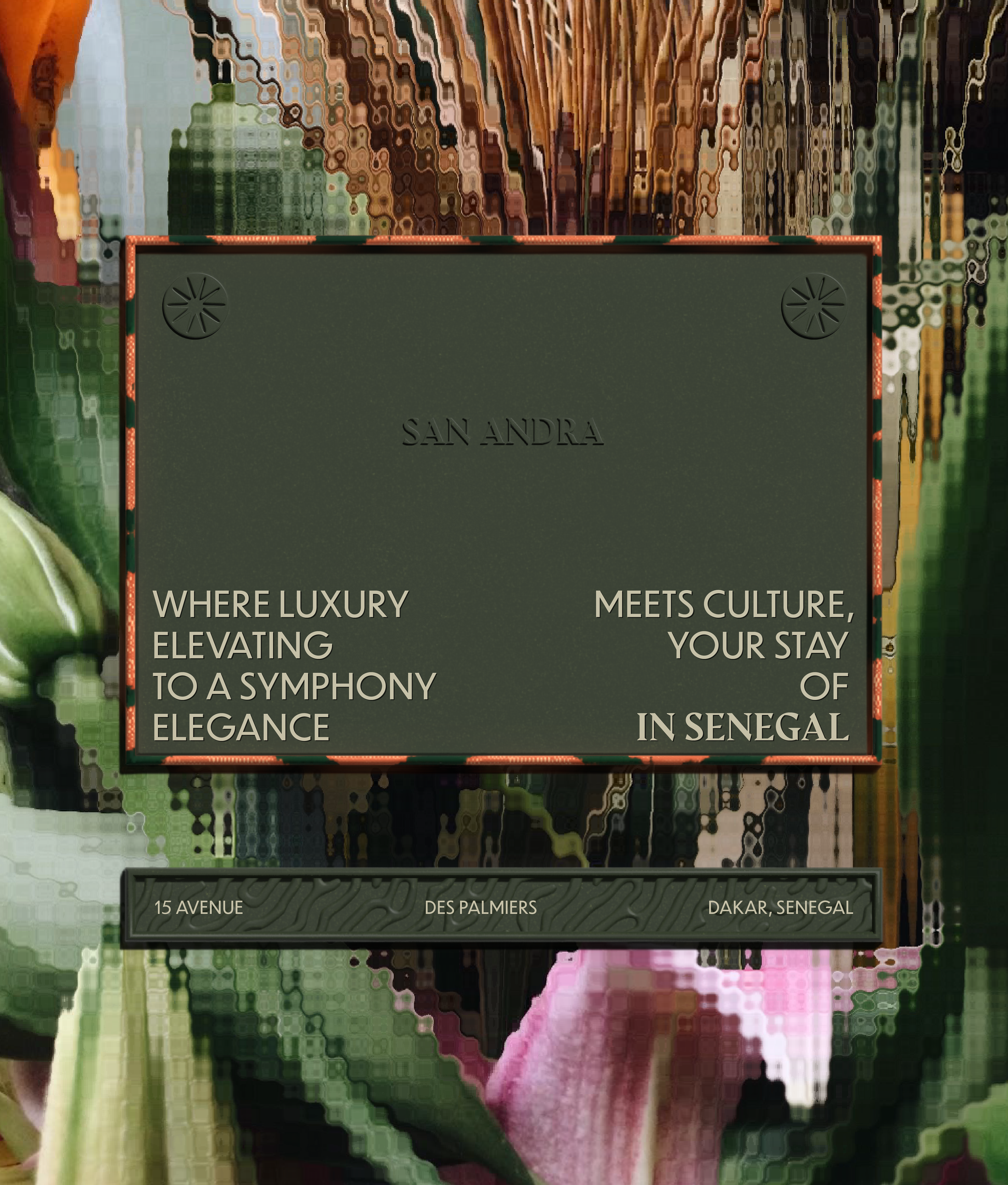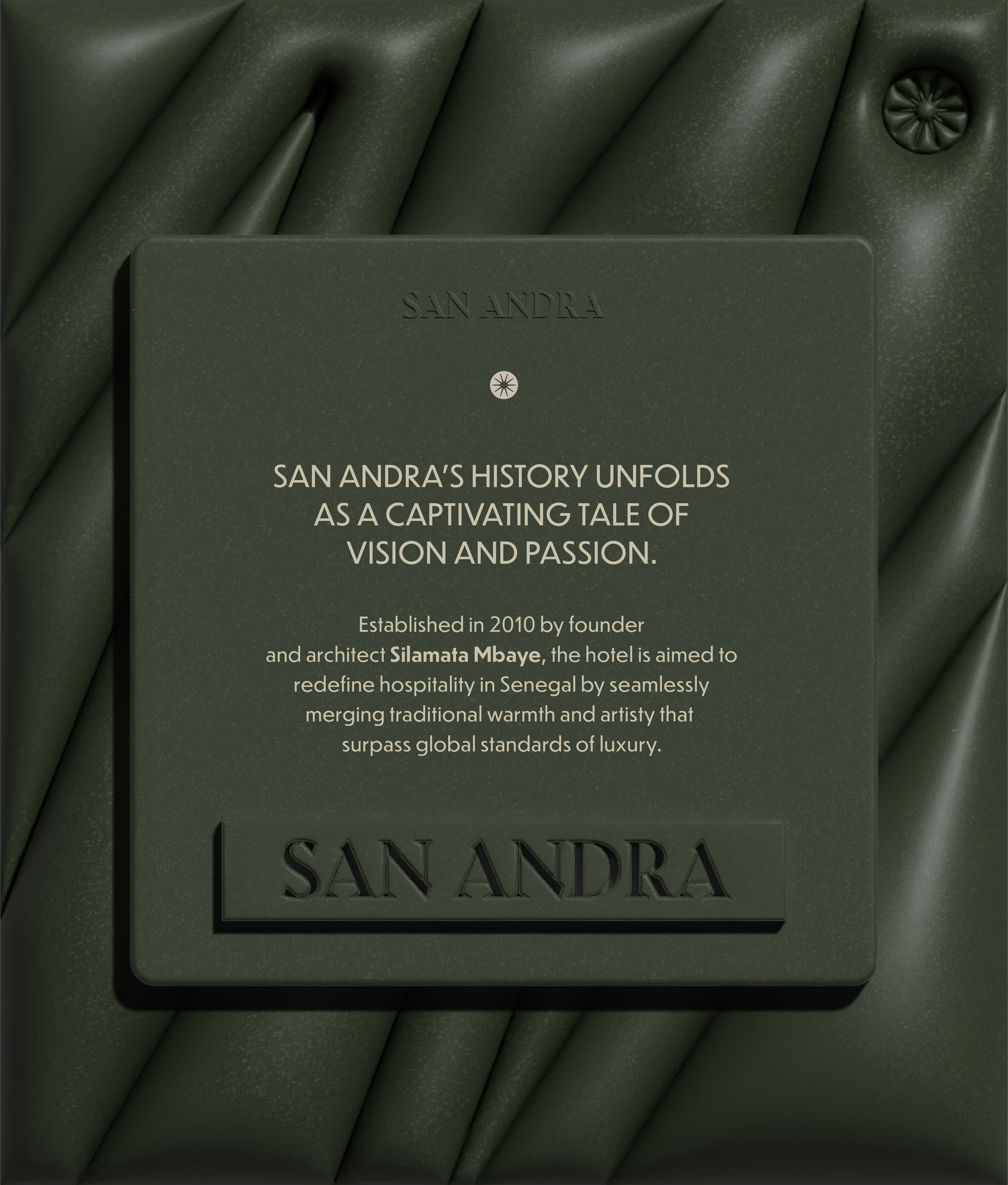 The branding design of San Andra is a meticulous fusion of sophistication, cultural resonance, and a nod to the luxurious experience that awaits guests. The logo, a visual centrepiece, encapsulates the essence of the hotel. It combines elements of Senegalese artistry with modern aesthetics, creating a symbol that is both timeless and contemporary.